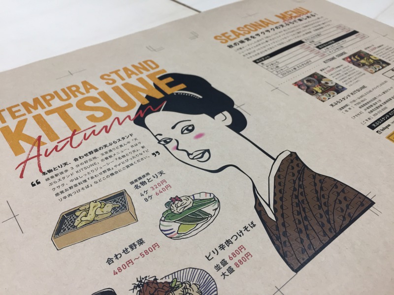 店舗デザインをお手伝いした、天ぷらスタンドKITSUNEのメニューが秋仕様に変わるため、デザインを少し変更しました。