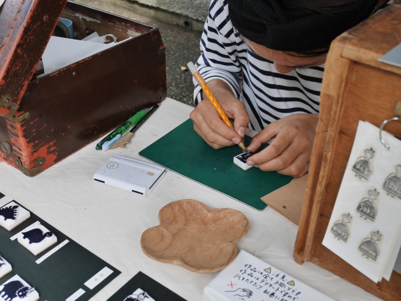その場で好きな文字をオーダーしてオリジナルのハンコを作ってくれている「消しゴムハンコ ヒビコレ」さん。