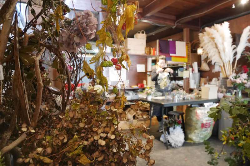 シンプルな銀色の扉を開けると、色とりどりの花やドライフラワーが目に飛び込んでくる素敵な空間でした。