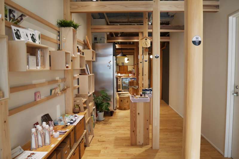 日本各所の木を使用しているカフェ&ショップ。