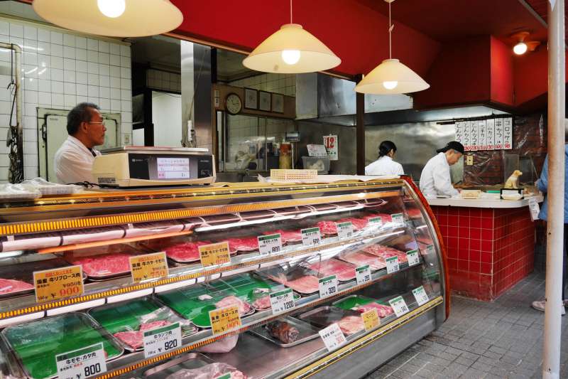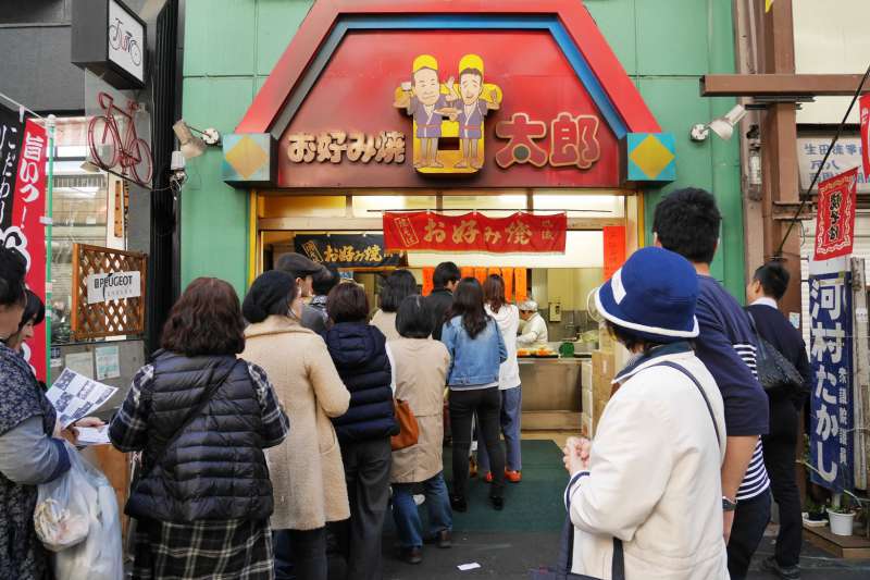 肉の丸小のコロッケやお好み焼き太郎など商店街に長く根付いているお店は行列ができていました。