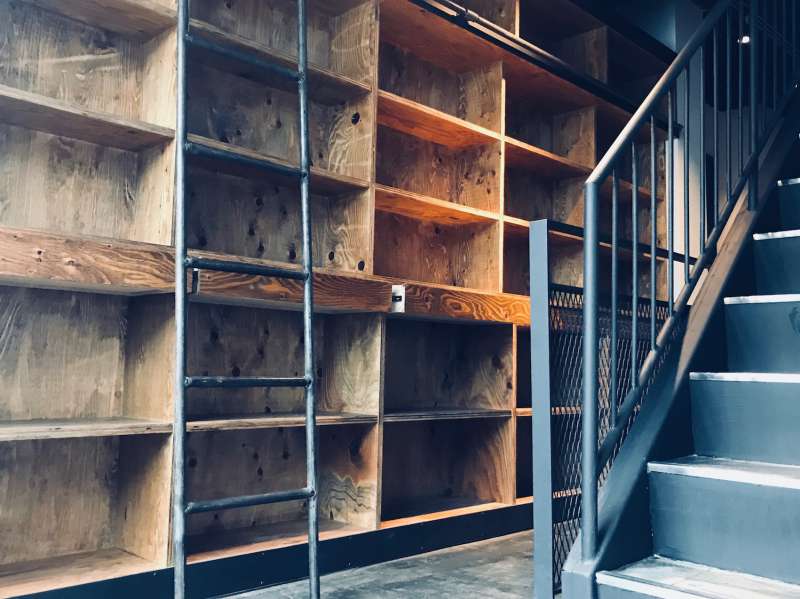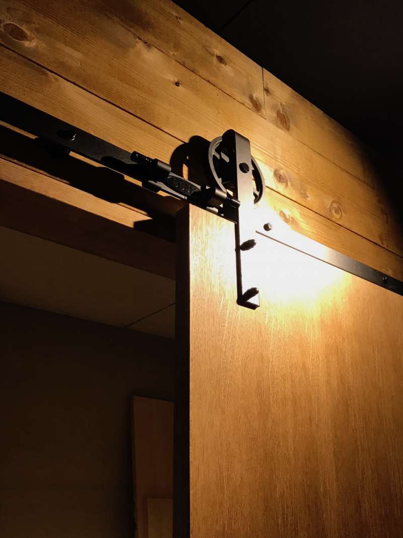 ザラつきを残した壁面の板貼り、ペーパーをあてツルツルにした天板、