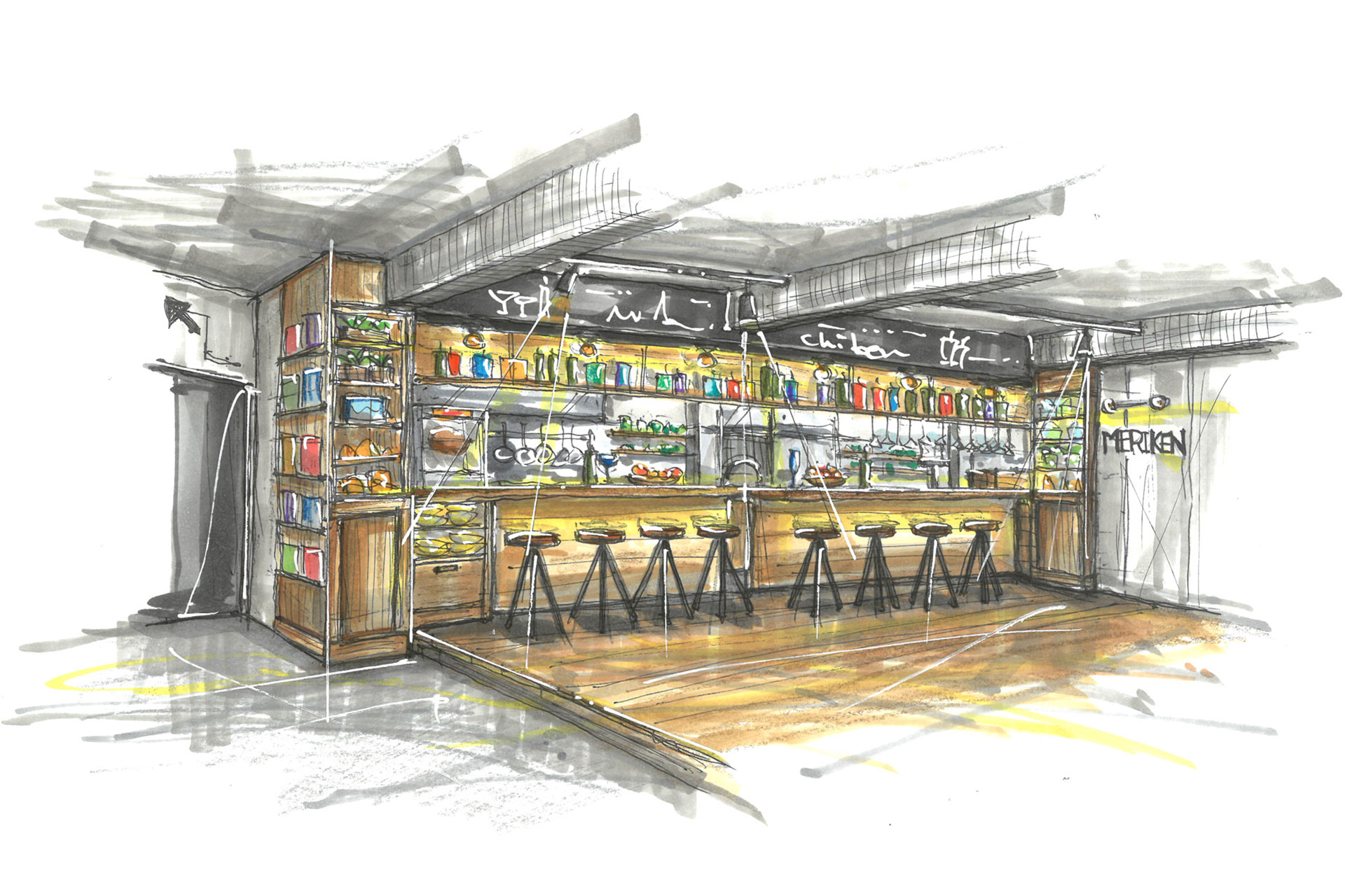 岡崎、豊橋で大人気のカジュアルイタリアンダイニング「メリケン」の名古屋初進出店舗の店舗デザインをお手伝い。
